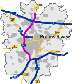 Bundesautobahn 391 (translates from German as Federal Motorway 391, short form Autobahn 391, abbreviated as BAB 391 or A 391) is an autobahn in Braunschweig, also known as the Braunschweiger Westtangente. Its purpose is to connect the A 2 with the A 39, passing the city of Braunschweig on the western side.