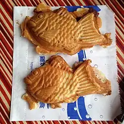Bungeo-ppang (Korean붕어빵; lit. carp bread) is a fish-shaped pastry stuffed with sweetened red bean paste, which originated from the Japanese taiyaki.[1] One of South Korea's most popular winter street foods,[2][3] the snack is often sold at street stalls, grilled on an appliance similar to a waffle iron but with a fish-shaped mold. Red bean paste is the standard filling but many bungeo-ppang sold as street food are filled with pastry cream (called "choux-bung" as the cream is called "choux-cream" in South Korea), sweet potato, pizza toppings, chocolate, kimchi and others. Usually, it costs about 1,000 won (KRW) for three bungeo-ppang. However, small bungeo-ppang costs 1,000 won for five and large bungeo-ppang costs 2,000 won for one, indicating that the price range varies depending on the size.[4]