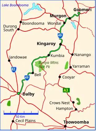 The Bunya Highway is a state highway of Queensland, Australia. It is a relatively short road, running approximately 173 kilometres in a south-westerly direction from Goomeri to Dalby. The highway connects the Warrego and Burnett Highways.[1]