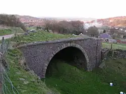 ![]() Disused railway bridge, Burbage,which carried the old Macclesfield Road over the line. Viewed looking NE over Burbage and Buxton. The bridge is completely filled some 15 yards in. To the north lies the 500 yd Burbage Tunnel which took the line into the Goyt Valley. | |