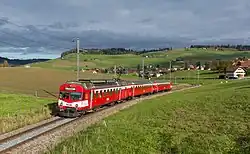 Double set, each with a BCe-4/4 power car in front and behind, in Konolfingen. -