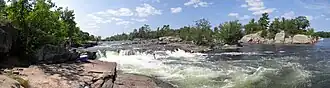 The falls (more accurately described as a chute or cascade,[1] since the drop in water level is more horizontal than vertical) are created by a narrowing in the flow of water between Lovesick Lake and Lower Buckhorn Lake on the west and Stoney Lake to the east.[2] At one time the landform was known as the "Burleigh chute".[3]
