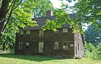 The town of Harwinton was established in 1737 from land formerly part of Hartford and Windsor. Burlington Road, now Connecticut Route 4, was then as now the main road between Farmington and Litchfield. The junction with Harmony Hill Road and Locust Road, east of the village center, formed as a small community center known as Catlin's Corners, named for Abraham Catlin, the first settler to the area who also operated a small shop. Instead of dispersed farmsteads, the area grew with houses stretched along Harmony Hill Road north of the junction, with six houses built before the turn of the 19th century, and a school was added at the northeast corner of the junction in the late 18th century.[2]