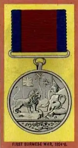 The Burma Medal is a campaign medal awarded by the Governor-General of India to native Indian soldiers of the armies of the Honourable East India Company (HEIC) who participated in the First Burma War from April 1824 to February 1826.[1]