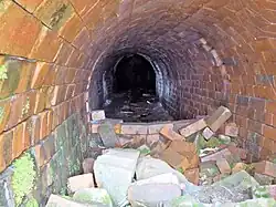 - The Union Pit 53°46′01″N 2°12′36″W / 53.767°N 2.210°W was sunk in about 1853 in Walk Mill, Cliviger, where the Cliviger Coal Company had its headquarters. Its shaft was 450 feet deep and a drift accessed the workings. The colliery had a gasometer that supplied gas to light the shaft bottom, the surface buildings and nearby miners' cottages. Coal was moved to the sidings that served Railway Pit along a tramway.[54] In 1910 it employed 10 miners and 19 surface workers.[84] Union Pit closed in 1943. Steps that accessed the shaft and the drift's stone arch survive.[54] Hole House Pit 53°46′01″N 2°12′58″W / 53.767°N 2.216°W, situated west of the bridge where the Copy Pit rail route crosses Burnley Road, was the pumping shaft for Union Pit. It closed in 1939 and the site was cleared in 1964.[54]