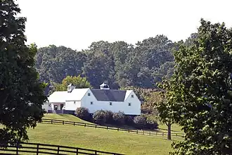 Burrland Farm Historic District is a historic home and farm complex and national historic district located near Middleburg, Fauquier County, Virginia. The district encompasses 22 contributing buildings, 2 contributing sites, 14 contributing structures, and 1 contributing object on a 458-acre thoroughbred horse breeding and training farm. The buildings were built between 1927 and 1932, and include a Georgian Revival style training barn, a polo barn, a stallion barn, two broodmare barns, a yearling barn, a field shed, an equipment shed, a farm manager's house / office, a trainer's cottage, a mess hall quarters, a foreman's dwelling, three mash houses, five garages, a pumphouse, and a feed and storage warehouse. The contributing structures include a silo, a springhouse, three loading chutes, two teasing chutes, two rings, three run-in sheds, one sun hut and an entrance gate. The original Burrland house was built in 1879 and expanded in 1927 for William Ziegler Jr. by architect William Lawrence Bottomley. Ziegler sold the property in 1955 to Eleonora Sears, who "deliberately gutted and burned [the mansion] down" in 1961. She then sold the farm in 1966.[3][4]