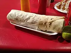 A burro percherón is a traditional dish from the Mexican state of Sonora, originating in the cities of Hermosillo and Guaymas. A variation of the classic burrito, it is one of the most popular foods in these two cities, being offered in several establishments, both establishments and mobile food trucks, where they are offered mainly at night, although recently there are establishments that offer burro percherón in its menu throughout the day. Among the main and most striking features of burro percherón is that they are large in size and have a distinct taste due to the combination and concentration of the ingredients. Traditionally the burro percherón are prepared with grilled or charcoal-roasted meat, avocado, Mexican cheese or chihuahua cheese, and tomatoes (although variants exist in each restaurant). At present, the number of establishments serving burros percherones are growing and there are chains that manage franchises extending to several parts of the country.[1]