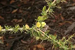 Bursaria longisepala is a spiny, sprawling shrub that typically grows to a height of less than 1 m (3 ft 3 in), some stands retaining juvenile characteristics. Young plants have clustered, thin, more or less sessile elliptic leaves 8–12 mm (0.31–0.47 in) long and 1.0–1.5 mm (0.039–0.059 in) wide with toothed edges. Adult plants have sessile, dark green, narrowly elliptic leaves 6–9 mm (0.24–0.35 in) long and 1–3 mm (0.039–0.118 in) wide clustered around spiny side-shoots. The flowers are arranged singly, in pairs or in small groups at the ends of branchlets, each flower on a pedicel 2–5 mm (0.079–0.197 in) long. The sepals are larger in this species than in others of the genus, green or cream-coloured, 3.5–4.0 mm (0.14–0.16 in) long, free from each other and spreading from the base. The five petals are white and spread from the base, 6–8 mm (0.24–0.31 in) long. Flowering mainly occurs in summer and the fruit is a concave capsule 5–6 mm (0.20–0.24 in) long and 5–8 mm (0.20–0.31 in) wide.[2][3]