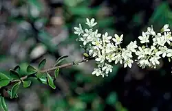 Bursaria reevesii is an erect or sprawling, multi-stemmed shrub that typically grows to a height of up to 3 m (9.8 ft), its young side-shoots armed with spines. New growth has elliptic leaves clustered around the spiny side-shoots, the edges of the leaves toothed. Adult growth has fewer spines and egg-shaped leaves with the narrower end towards the base, 16–30 mm (0.63–1.18 in) long and 5–8 mm (0.20–0.31 in) wide on a petiole 1–3 mm (0.039–0.118 in) long. The flowers are white and arranged in small groups, each flower on a pedicel4–6 mm (0.16–0.24 in) long with paired bracts at the base. The sepals are 1–2 mm (0.039–0.079 in) long and spread from the base and the five petals are white, 5–6 mm (0.20–0.24 in) long and also spread from the base. Flowering mostly occurs in April and May and the fruit is a rounded capsule 6–9 mm (0.24–0.35 in) in diameter.[2]
