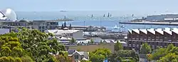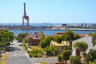 Looking down Burt Street towards harbour and Gage Roads - the structures mid photo on the right is the Army Museum