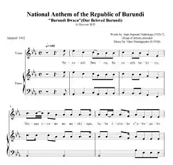"Burundi Bwacu" (Kirundi pronunciation: [buɾúːndi bɡát͡ʃu]; "Our Burundi") is the national anthem of Burundi. Written in the Kirundi language by a group of writers led by Jean-Baptiste Ntahokaja, a Catholic priest, and composed by Marc Barengayabo, it was adopted upon independence in 1962.[1][2]