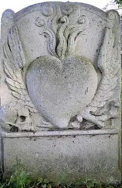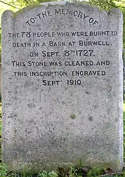 The victims were buried in the churchyard of St Mary's, at the opposite end of the High Street, beneath a stone engraved with a blazing heart and angels' wings. An inscription on the reverse, added in 1910 when the stone was restored, states: "To the memory of the 78 people who were burnt to death in a barn at Burwell on Sept 8th 1727." Inside the church is a separate memorial to two other victims, John and Ann Palmer. [38] On 8 September 2005, a memorial plaque was unveiled at the site of the fire.[39]