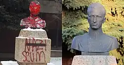 The bust was vandalised with the word "Nazi scum" in 2019.[8] The sculpture was again dubbed with graffiti in 2021 with the words "Actual Nazi" written in red paint.[7] In reaction to the second vandalism, the Ukrainian Youth Association issued as statement, calling the accusations that Ukrainian nationalist fighters during the Second World War were Nazis "Communist propaganda".[12]
