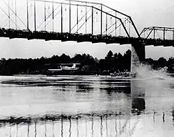 The original Buster Boyd Bridge was built at a cost of $120,000, with Mecklenburg County paying two-thirds of the cost and York County, South Carolina paying the remaining one-third.[2] Mecklenburg County raised their portion of the funds by selling $75,000 in bonds[3] The bridge spanned 1,378 feet across in 10 spans. It officially opened to automobile traffic on January 9, 1923.[2] The bridge featured an excessively high lake clearance due to known plans by Catawba Power Company to build a larger dam, which would make Lake Catawba much larger and deeper in the following year.[4]