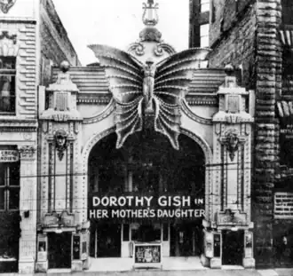 The theater's facade featured a terra-cotta butterfly with 1,000 light bulbs. The butterfly measured 27 ft (8.2 m) wide and at the center of the butterfly was a woman's body.[13][2] The facade had a total of 3,000 lightbulbs. Many of the decorative items including the butterfly were ordered pre-made. The butterfly was seen in a Decorators Supply Company catalog.[2] A Chicago company supplied decorative elements and terra-cotta items.[18]