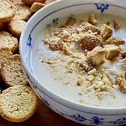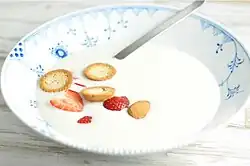 Koldskål is made with buttermilk and other varying ingredients: eggs, sugar, yoghurt and/or other similar dairy products, vanilla, and sometimes lemon.[1] The dish arose when buttermilk became commonly available in Denmark in the early 1900s and was eaten chilled most days during the summer as a dessert or snack. Since 1979, there have been ready-made varieties on the Danish market, originally from Esbjerg Dairy, but now from a range of dairies, including Arla.[2]