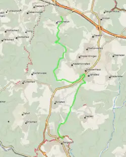 From its starting point at the St.-Kastor Chapel in Rengsdorf, the trail follows the Völkerwiesenbach valley through beech grove to the hut Philippsruhe at the Kreisstraße 105. Crossing this street, the trail passes Bonefeld in the direction of Straßenhaus. There is the option to follow a small detour to the Alteburg Bonefeld, a monument of the Middle Ages, and the Keltengräber (Celtic graves). The trail crosses the K105, and goes along a replica of a charcoal production hill and through the sequoia forest, then crossing the B256 in Straßenhaus. The trail follows the direction Schöne Aussicht, with a view on the pit frame of the abandoned Grube Georg, and leads through the Fockenbach valley in the direction Hümmericher Mühle (Hümmerich mill). Passing the Alexander gallery and the quarry Louisenglück, after a final rise the trail reaches Hümmerich with its weighing scale museum.[1][2]