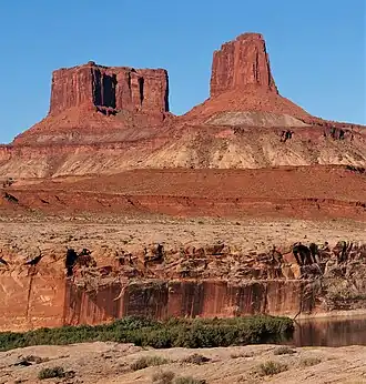 Buttes of the Cross is two sandstone summits located in the northern reach of Glen Canyon National Recreation Area, in Wayne County of Utah, United States.[3] The larger and higher south butte reaches an elevation of 5,642 feet (1,720 meters), whereas the north butte rises to 5,569 feet, with approximately 0.6 miles (0.97 km) separation between them.[2] When viewed from the north-northeast near Labyrinth Canyon, they align to form the shape of a cross, creating the appearance of a single butte. The name "Butte of the Cross" was first applied by John Wesley Powell during the Powell Geographic Expedition of 1869.[3] A few miles further down the Green River, Powell finds that this geographical feature is two buttes when viewed from the east, so it was renamed Buttes of the Cross.[4] Buttes of the Cross towers over 1,400 feet (430 meters) above its surrounding terrain. It is situated 6.8 miles west of Candlestick Tower, and one-half mile outside the boundary of Canyonlands National Park.