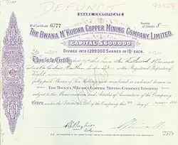 Bwana Mkubwa was recapitalized in 1922 on the strength of a series of experiments made on the ore by Minerals Separation Ltd,[10] In the late 1920s Ernest Oppenheimer prevented the Americans from dominating the Northern Rhodesian mining industry.[11] In the 1950s people casualties were taken to Bwana Mkubwa for medical treatment.[12] The copper processing plant was built in 1998, at a cost of approximately $30 million. It was originally constructed as a five-year life short-term plant with a capacity of 10,000 tonnes/year of finished copper.[13]