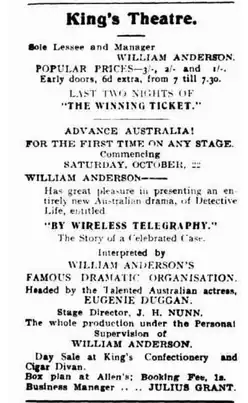 - ^ "King's Theatre--By Wireless Telegraphy". The Age. No. 17,350. 24 October 1910. p. 9. Retrieved 7 February 2024 – via National Library of Australia.