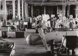 Following the Fall of Singapore, a secret armament depot was established in Byford in 1942, due to its rail access and being far enough from the coast to be safe from a seaborne attack by the Japanese.[20] Other sites considered were Cannington and Cardup. In December 1942, the Allied Works Council began storing explosives from Britain. The depot was later expanded to provide for mines and gunnery equipment. Throughout World War II, it supplied armaments to Allied navies except the Americans, and when British submarines began operating in Fremantle in 1944, it was the assembly point of submarine ammunition. At its peak it employed around 250 civilian workers, and by May 1948 it was 141. The depot was disclosed to the public at the end of the war. It costed £250,000 to construct, and had a value of £1,000,000 by 1945.[21]