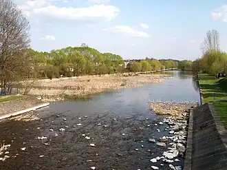 The canal is a fairly lively stream channel at the beginning. Just below the weir, and the bridge carrying 29 Listopada Street (National Road 8, National Road 16, and European route E67) over the canal, it is a series of shoals and rocks with a width of approximately 40 m (130 ft). A street named after Ludwik Waryński, an activist and theoretician of the socialist movement in Poland, runs along the right bank of the canal. There are a number of houses along the edge of the water with a number of small private docks for boats and for fishing.