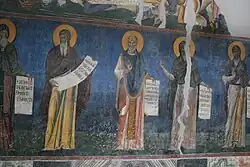 The dark variation is best described as the color of the Byzantine night sky; it resembles dark blue-grey, Prussian and Navy blue, well attested on frescoes and mosaics.[2]