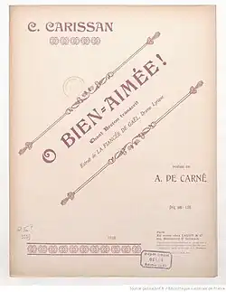 Carissan collaborated with Adrien de Carné and Théophile Gautier. For her own melodies, she often set music to poems by Thibaut de Champagne, Thomas Moore and Alphonse de Lamartine, including the libretto Rebecca inspired by the Book of Genesis. This piece was written for soloists, choirs and orchestra and is divided into eight scenes. She released it under the pseudonym E. de Nassirac, Carissan backwards. It was performed in Paris several times during 1893 at the Salle Érard and received critical acclaim at its premiere. The score also exists in reduction for voice and piano.[3][5]
