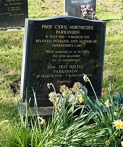 After the death of his second wife in 1984, in 1985 Parkinson married Iris Hilda Waters (died 1994) and moved to the Isle of Man. After two years there, they moved to Canterbury, Kent,[89] where he died in March 1993, at the age of 83. He was buried in Canterbury, and the law named after him is quoted as his epitaph.