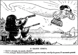 ![]() Brazilian political cartoon from February 1865 stating that the comet, usually a harbinger of war, was actually going to Paris to escape the Uruguayan and Paraguayan Wars Brazil was fighting at the time. | |