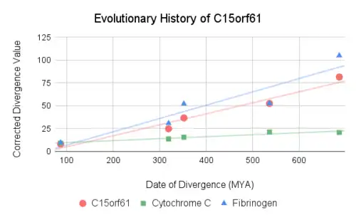 The rate of evolution of c15orf61 was compared to that of cytochrome c and fibrinogen. C15orf61 appears to be evolving at a moderate pace, slower than fibrinogen alpha chain but faster than cytochrome c. This suggests that C15orf61 is not under intense evolutionary pressure to evolve rapidly, but is in a complex that has the ability to mutate over time.
