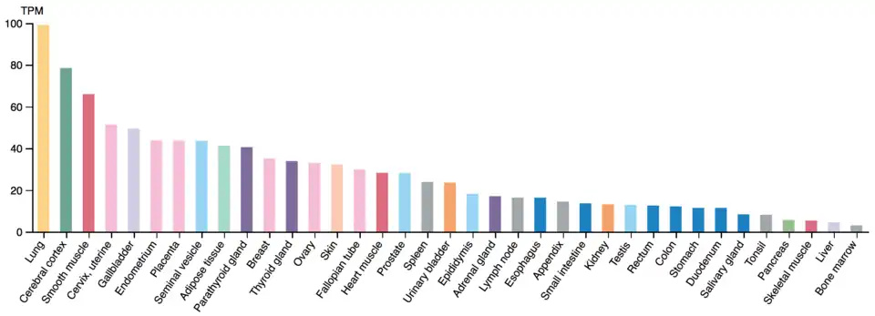 RNA-seq tissue data revealed high expression of C1orf198 across all tissues, but especially high expression in lung, heart, spinal cord, and brain tissues.[8] Expression from RNA-seq assays are reported as mean TPM, or transcripts per million, which correspond to mean values of the different individual samples from each tissue. Transcription profiling by high throughput sequencing revealed similar patterns of expression.[9]