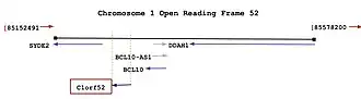 C1orf52 is located on the minus strand at 1p22.3.[6] The gene is 9,720 base pairs and has 3 exons.[7]