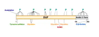 C4orf51 is predicted to undergo several post-translational modifications, including phosphorylation, glycation, and acetylation.[20][21][22] Though SUMOylation and tyrosine sulfation are also predicted, the sites of these modifications are not conserved in distant C4orf51 orthologs.[23][24]