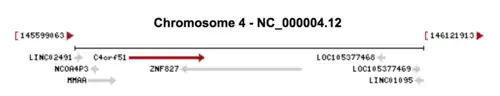 The C4orf51 gene is located at 4q31.21 on the plus strand of chromosome 4.[6] The gene spans 120,289 base pairs and contains 6 exons.[7] The genomic neighborhood of C4orf51 includes LOC285422, LINC02491, NCOA4P3, and MMAA, all located upstream of C4orf51.[5] ZNF827 and LOC105377468 are located downstream of C4orf51.
