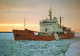 The vessel is powered by two fixed-pitch propellers and bow thrusters powered by three Alco 251F diesel-electric engines creating 8,847 horsepower (6,597 kW), and three Canadian GE generators producing 6 megawatts of AC power driving two Canadian GE motors creating 7,040 horsepower (5,250 kW).[1][2] The ship is also equipped with one Caterpillar C32 auxiliary generator and one Caterpillar 3306 emergency generator.[2] This gives the ship a maximum speed of 15.1 knots (28.0 km/h; 17.4 mph). Capable of carrying 1,086 long tons (1,103 t) of diesel fuel, Martha L. Black has a maximum range of 14,500 nautical miles (26,900 km; 16,700 mi) at a cruising speed of 14 knots (26 km/h; 16 mph) and can stay at sea for up to 120 days.[2] The ship is certified as Arctic Class 2.[2]