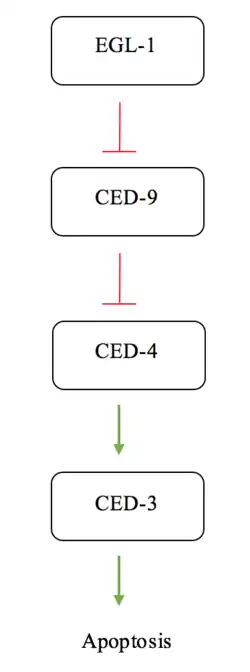 Cell death, or apoptosis during early development is crucial for the correct morphology and refractivity of adult C. elegans.[13] This process involves a signal and interaction cascade of proteins leading to the engulfment and death of the targeted cell. Proteins in this cascade can be categorized into two groups; pro-apoptotic and anti-apoptotic.[13] Pro-apoptotic proteins activate the apoptosis pathway while anti-apoptotic proteins suppress the pathway.[14] CED-9 is classified as an anti-apoptotic protein.[15]