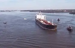 On November 26, 2004, the Athos I, a 750-foot (230 m) single-hull oil tanker carrying 13.3 million US gallons (50×106 L) of oil that had traveled from Venezuela was maneuvering to dock at a Citgo dock on the Delaware River near its refinery at Paulsboro. An anchor in the river's bed, known to have been there since at least 2001, caught on the ship's hull and tore a 6-foot (1.8 m) gash into it, releasing more than 260,000 US gallons (980,000 L) of oil into the river.[2] The spill spread downstream affecting the shoreline in more than three states (Pennsylvania, New Jersey, and Delaware), killing over 11,000 birds, temporarily shut down the Salem Nuclear Power Plant, and halted commercial use of the river for several weeks during cleanup efforts.[3][4] At the time, it was considered the second worst oil spill in the United States following the Exxon Valdez oil spill, with cleanup costs over US$267 million.[5] The spill led to passage of the Coast Guard and Maritime Transportation Act of 2006 which among provisions, tripled fines resulting from oil spills from single-hulled vessels to encourage double-hull use, as well as requiring those with knowledge of obstructions in waterways to inform the Coast Guard for immediate removal.[5]