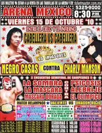 Los Invasores featured in four of the six matches at CMLL's 2010 Sin Salida show.[8] The following month the Promociones Gutiérrez 1st Anniversary Show featured a series of "CMLL vs. outsiders" matches, some featuring fully fledged Los Invasores members and some featuring wrestlers who did not regularly work for CMLL making a special appearance. One of the wrestlers who had not worked for CMLL up until that point was Charly Manson, who would parlay his appearance at the anniversary show into a full-time contract with CMLL as part of Los Invasores. The main event was a 5 team Ruleta de la Muerte elimination match that came down to Místico and El Oriental (representing Los Invasores) wrestling in a Lucha de Apuestas, mask vs. mask match which Místico won, forcing El Oriental to unmask.[9] Over the summer of 2010 Psicosis II began to develop a feud with Místico, which was used as the driving force behind booking a 14-man steel cage Lucha de Apuesta match that was the main event of the CMLL 77th Anniversary Show on September 4, 2010. El Alebrije, Histeria, Olímpico and Psicosis represented Los Invasores in the cage.[10] The unmasked members of Los Invasores, specially Mr. Águila, Garza, Manson and El Oriental began a feud with La Peste Negra, which quickly led to a Lucha de Apuesta, a hair vs. hair match.[11] The 14-man steel cage saw Histeria and El Alebrije leave the cage in the early parts of the match and Psicosis II escaping the cage as the 12th and las tman, all keeping their masks safe. The match came down to La Sombra pinning Olímpico to unmask him.[12] In the weeks following the 77th Anniversary show Negro Casas and the rest of La Peste Negra ("The Black Plague") began to face off against various Invasores trios, oftentimes across from Charly Manson. During those matches the storyline that emerged was the personal rivalry between Casas and Los Invasores newest member Charly Manson, one that often saw Los Invasores either cheat to win or get intentionally disqualified as they attacked Casas. After several weeks of fighting Casas laid out a challenge to Manson for him to "bet" his hair on a Lucha de Apuestas between the two, a challenge Manson accepted, noting that he had never lost a Luchas de Apuestas match in his career.