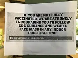 - ^ Johnson, Brent; Arco, Matt (July 28, 2021). "N.J. 'strongly recommends,' but does not mandate, indoor masks regardless of vaccination status". NJ.com. Retrieved August 6, 2021.