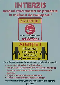On 22 April, President Iohannis issued a press release, stating the government's intention to adopt, by mid-May, official legislation requiring citizens to wear surgical masks in public.[90] That same day, Timișoara, Romania's third largest city, made the use of both facial masks and protection gloves mandatory in enclosed public spaces, including transportation.[91] This decision came a week after Constanța, a major urban centre and one of the country's main tourist destinations, took similar measures on 15 April.[92]