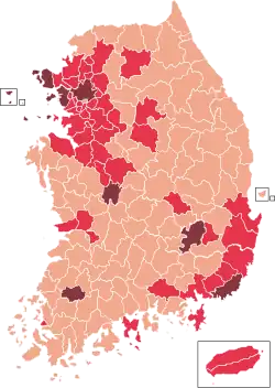 ![]() Map of special cities & municipals with confirmed or suspected coronavirus cases (as of 5 March 2022): Confirmed 1~9,999 Confirmed 10,000~99,999 Confirmed ≥100,000 | |
