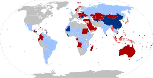 On 24 February, 15 countries imposed travel restrictions to and from South Korea.[63] It was reported that a senior health official overseeing the COVID-19 efforts in Daegu tested positive and was also a member of Shincheonji.[64][65] Within a few days, a petition to the nation's president urging for the disbandment of the church had over 750,000 signatures. Their headquarters in Gwacheon was raided by law enforcement and government officials said all 245,000 members of the religious group would be found and tested.[65]