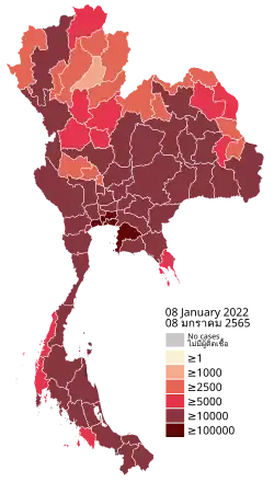 The COVID-19 pandemic in Southeast Asia is part of the ongoing worldwide pandemic of coronavirus disease 2019 (COVID-19) caused by severe acute respiratory syndrome coronavirus 2 (SARS-CoV-2). It was confirmed to have spread to Southeast Asia on 13 January 2020, when a 61-year-old woman from Wuhan tested positive in Thailand, making it the first country other than China to report a case.[2] The first death occurred on 2 February, involving a 44-year-old Chinese man in the Philippines, also the first outside China.[3] By 24 March, all states in the region had announced at least one case.