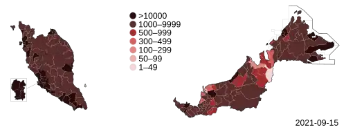 Brunei confirmed its first case on 9 March 2020 in Tutong, involving a 53-year-old man who had returned from Kuala Lumpur, Malaysia on 3 March.[9] It has spread to all districts of Brunei.