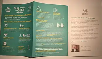 Many aspects of the response to COVID-19 were the responsibility of the devolved Welsh government.[7] Health is a devolved matter in Scotland, Wales and Northern Ireland. Though healthcare is largely run by the state across the UK (through NHS Wales in the Welsh case) with some private and charitable provision, policy and outcomes vary.[8][9] There was a Conservative Government in Westminster, and a Labour led Government in Cardiff; this ideological divide may have contributed to variances in approach.