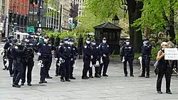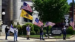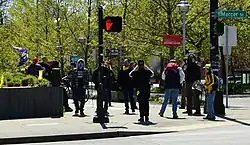 The reopen protests were generally small, with protester numbers ranging from a few dozen to the low hundreds; the first protest in Michigan drew twenty thousand protestors, as estimated by the state police.[21] Protesters included mainstream Republicans,[22] but also far-right groups including Proud Boys and armed militia movement supporters.[4] A large number of "anti-vax" advocates have attended, and some have been the organizers of local protests.[23][24] Ben, Chris and Aaron Dorr, three guns-rights activist brothers, are the organizers of protests in several Midwestern states.[25][26]