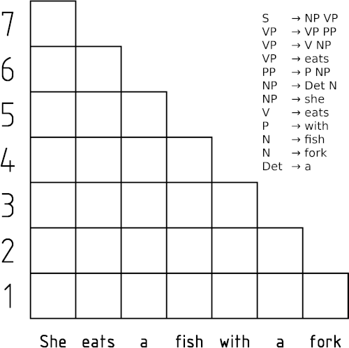 Now the sentence she eats a fish with a fork is analyzed using the CYK algorithm. In the following table, in , i is the number of the row (starting at the bottom at 1), and j is the number of the column (starting at the left at 1).