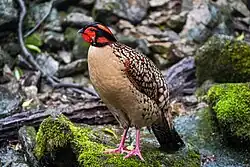 Cabot's tragopan (Tragopan caboti) is a pheasant found in south-east China. The common and scientific names of this large bird both commemorate the ornithologist Samuel Cabot III.[3] Other common names include the Chinese tragopan and the yellow-bellied tragopan. The population is divided into two subspecies, of which the dominant subspecies is found in the provinces of Fujian, Jiangxi, Zhejiang, and Guangdong, and T. c. guangxiensis is confined to northeastern Guangxi and southern Hunan. The IUCN has assessed it as being a "vulnerable species".