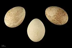 Breeding takes place in the spring and Cabot's tragopan has an elaborate courtship ritual. The nest is usually built off the ground in a fork in a tree and is made of grasses, mosses, feathers and leaves, but sometimes an empty nest of another bird species is used. A clutch of two to six eggs is laid and incubation is performed solely by the female. The eggs hatch in about twenty eight days and the female broods the young for two or three days after that. They then all leave the nest together, the chicks being able to fly soon after they hatch, and remain together for the winter, possibly joining with another family in a small group.[4][6]